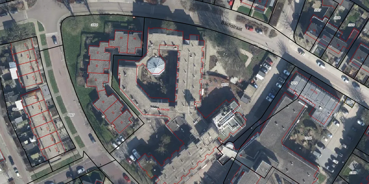 Het perceel waarop Bachstraat 29-k-201 staat heeft een oppervlakte van 6556 m². Dit is een zeer groot perceel. De perceeloppervlakte wordt geregistreerd door het Kadaster. Gedetailleerde informatie over de maten van dit perceel kunt u vinden in het rapport Kadastrale kaart met maatvoering van Bachstraat 29-k-201.