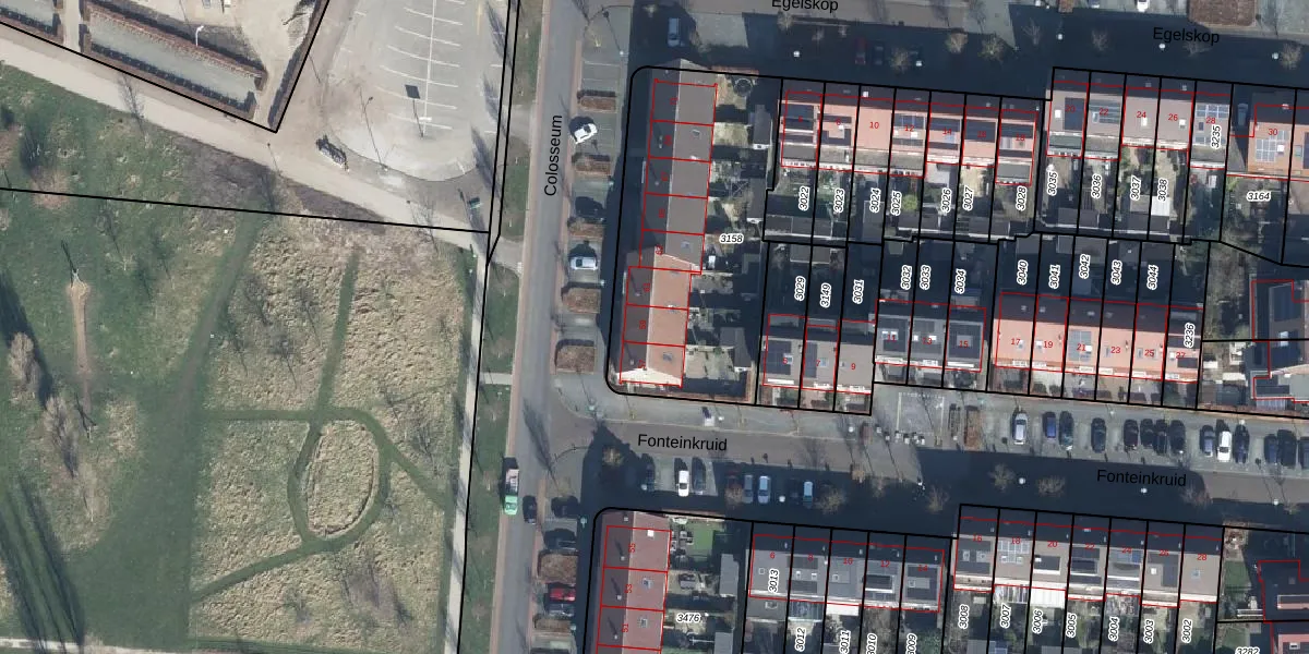 Het perceel waarop Colosseum 59 staat heeft een oppervlakte van 1143 m². Dit is een zeer groot perceel. De perceeloppervlakte wordt geregistreerd door het Kadaster. Gedetailleerde informatie over de maten van dit perceel kunt u vinden in het rapport Kadastrale kaart met maatvoering van Colosseum 59.