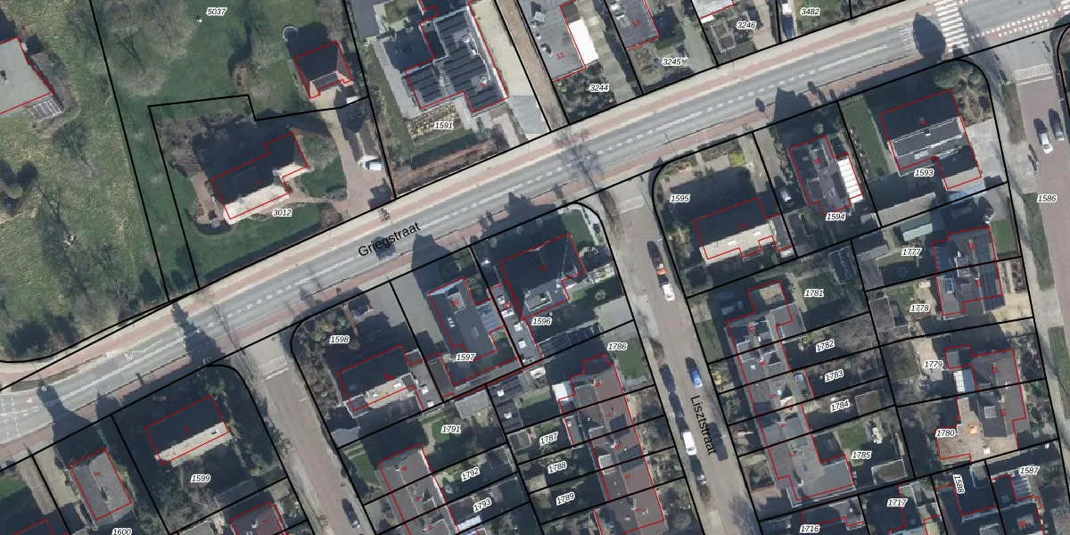 Griegstraat 12 is gelegen op kadastraal perceel ELS00K1596. Deze kadastrale aanduiding is uniek en wordt gebruikt door het Kadaster om eigendomsrechten en andere zakelijke rechten vast te leggen. Het perceel maakt onderdeel uit van de kadastrale gemeente Elst.