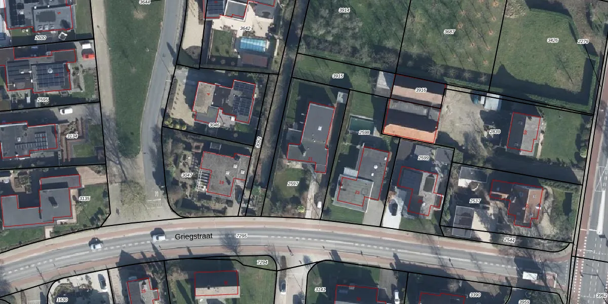 Griegstraat 21 is gelegen op kadastraal perceel ELS00I2597. Deze kadastrale aanduiding is uniek en wordt gebruikt door het Kadaster om eigendomsrechten en andere zakelijke rechten vast te leggen. Het perceel maakt onderdeel uit van de kadastrale gemeente Elst.