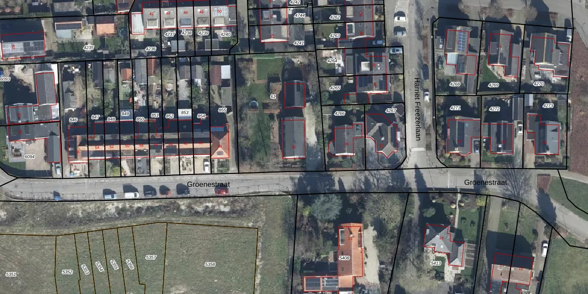 Het perceel waarop Groenestraat 36 staat heeft een oppervlakte van 1160 m². Dit is een zeer groot perceel. De perceeloppervlakte wordt geregistreerd door het Kadaster. Gedetailleerde informatie over de maten van dit perceel kunt u vinden in het rapport Kadastrale kaart met maatvoering van Groenestraat 36.