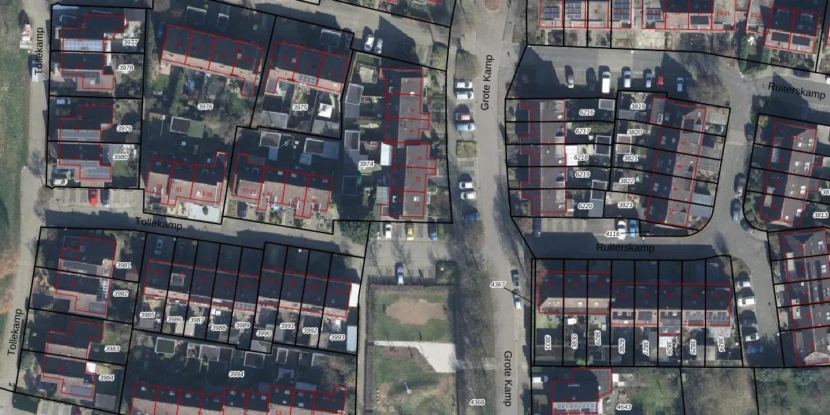 Het perceel waarop Grote Kamp 12 staat heeft een oppervlakte van 1593 m². Dit is een zeer groot perceel. De perceeloppervlakte wordt geregistreerd door het Kadaster. Gedetailleerde informatie over de maten van dit perceel kunt u vinden in het rapport Kadastrale kaart met maatvoering van Grote Kamp 12.