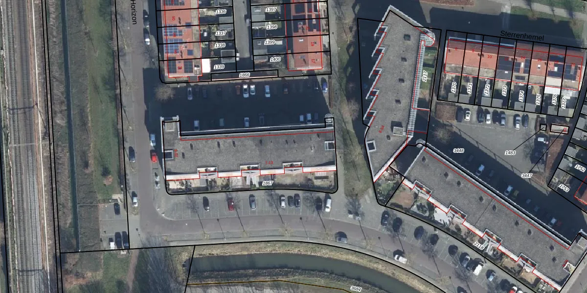 Het perceel waarop Horizon 38 staat heeft een oppervlakte van 1226 m². Dit is een zeer groot perceel. De perceeloppervlakte wordt geregistreerd door het Kadaster. Gedetailleerde informatie over de maten van dit perceel kunt u vinden in het rapport Kadastrale kaart met maatvoering van Horizon 38.