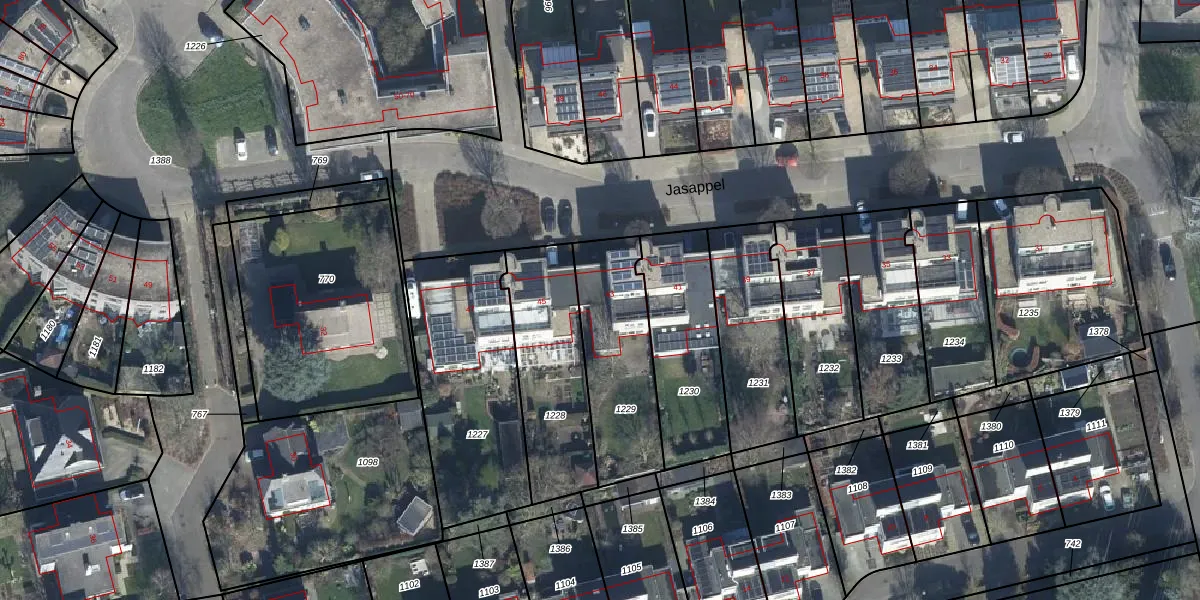Het perceel waarop Jasappel 43 staat heeft een oppervlakte van 451 m². Dit is een groot perceel. De perceeloppervlakte wordt geregistreerd door het Kadaster. Gedetailleerde informatie over de maten van dit perceel kunt u vinden in het rapport Kadastrale kaart met maatvoering van Jasappel 43.