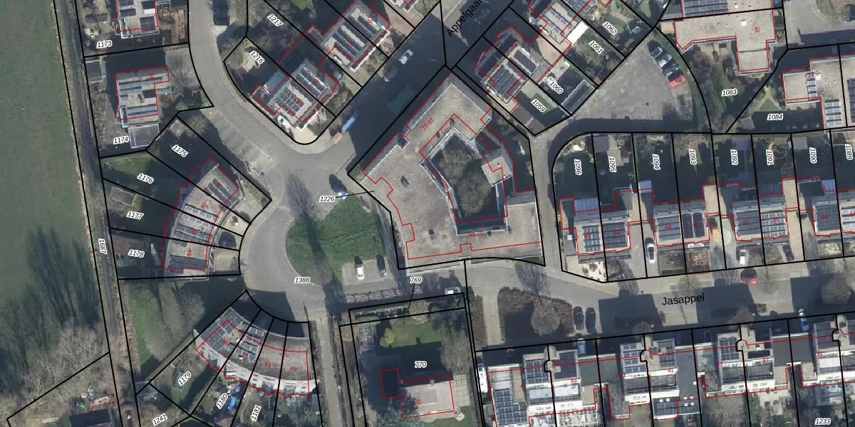 Het perceel waarop Jasappel 68 staat heeft een oppervlakte van 1375 m². Dit is een zeer groot perceel. De perceeloppervlakte wordt geregistreerd door het Kadaster. Gedetailleerde informatie over de maten van dit perceel kunt u vinden in het rapport Kadastrale kaart met maatvoering van Jasappel 68.