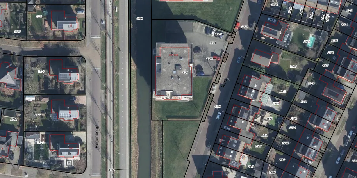 Het perceel waarop Juno 111 staat heeft een oppervlakte van 2045 m². Dit is een zeer groot perceel. De perceeloppervlakte wordt geregistreerd door het Kadaster. Gedetailleerde informatie over de maten van dit perceel kunt u vinden in het rapport Kadastrale kaart met maatvoering van Juno 111.