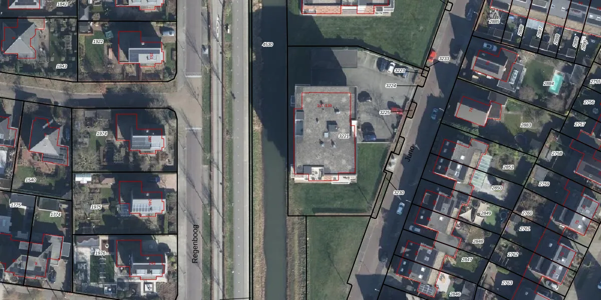 Het perceel waarop Juno 113 staat heeft een oppervlakte van 2045 m². Dit is een zeer groot perceel. De perceeloppervlakte wordt geregistreerd door het Kadaster. Gedetailleerde informatie over de maten van dit perceel kunt u vinden in het rapport Kadastrale kaart met maatvoering van Juno 113.