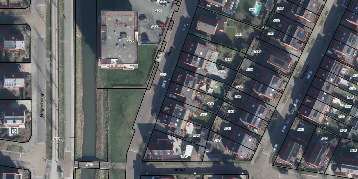 Het perceel waarop Juno 66 staat heeft een oppervlakte van 279 m². Dit is een middelgroot perceel. De perceeloppervlakte wordt geregistreerd door het Kadaster. Gedetailleerde informatie over de maten van dit perceel kunt u vinden in het rapport Kadastrale kaart met maatvoering van Juno 66.