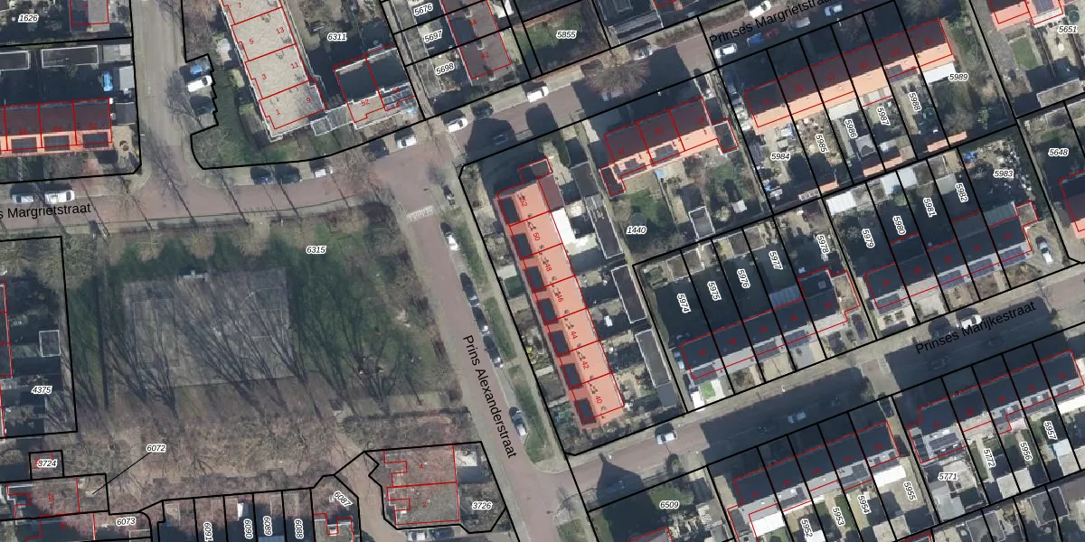 Het perceel waarop Prins Alexanderstraat 48 staat heeft een oppervlakte van 2184 m². Dit is een zeer groot perceel. De perceeloppervlakte wordt geregistreerd door het Kadaster. Gedetailleerde informatie over de maten van dit perceel kunt u vinden in het rapport Kadastrale kaart met maatvoering van Prins Alexanderstraat 48.