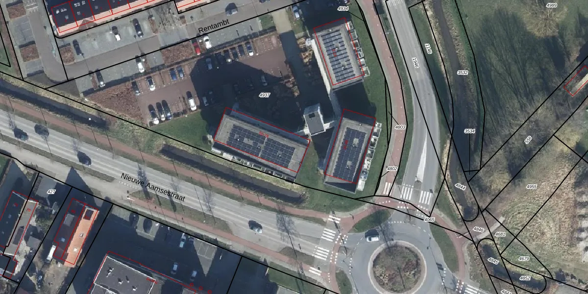 Het perceel waarop Rentambt 56 staat heeft een oppervlakte van 4588 m². Dit is een zeer groot perceel. De perceeloppervlakte wordt geregistreerd door het Kadaster. Gedetailleerde informatie over de maten van dit perceel kunt u vinden in het rapport Kadastrale kaart met maatvoering van Rentambt 56.
