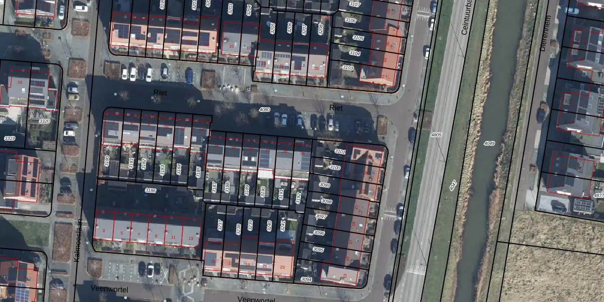 Het perceel waarop Riet 26 staat heeft een oppervlakte van 143 m². Dit is een middelgroot perceel. De perceeloppervlakte wordt geregistreerd door het Kadaster. Gedetailleerde informatie over de maten van dit perceel kunt u vinden in het rapport Kadastrale kaart met maatvoering van Riet 26.