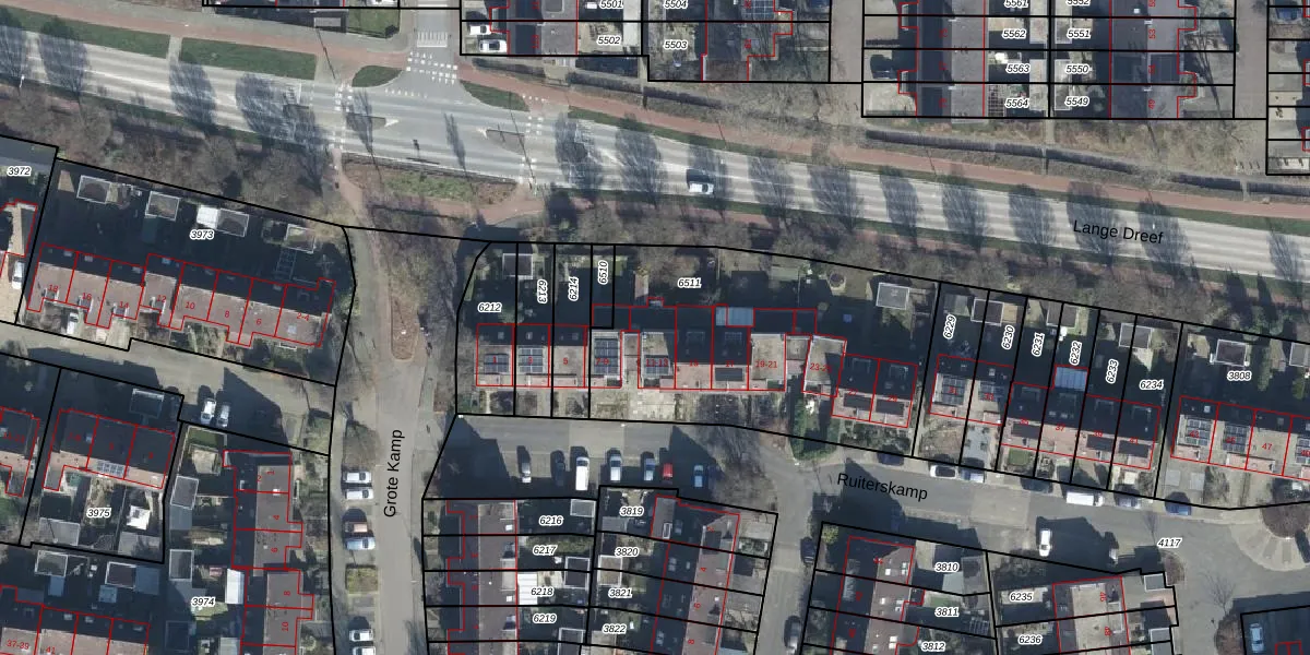 Het perceel waarop Ruiterskamp 13 staat heeft een oppervlakte van 1352 m². Dit is een zeer groot perceel. De perceeloppervlakte wordt geregistreerd door het Kadaster. Gedetailleerde informatie over de maten van dit perceel kunt u vinden in het rapport Kadastrale kaart met maatvoering van Ruiterskamp 13.