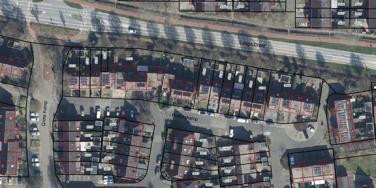 Het perceel waarop Ruiterskamp 29 staat heeft een oppervlakte van 1352 m². Dit is een zeer groot perceel. De perceeloppervlakte wordt geregistreerd door het Kadaster. Gedetailleerde informatie over de maten van dit perceel kunt u vinden in het rapport Kadastrale kaart met maatvoering van Ruiterskamp 29.