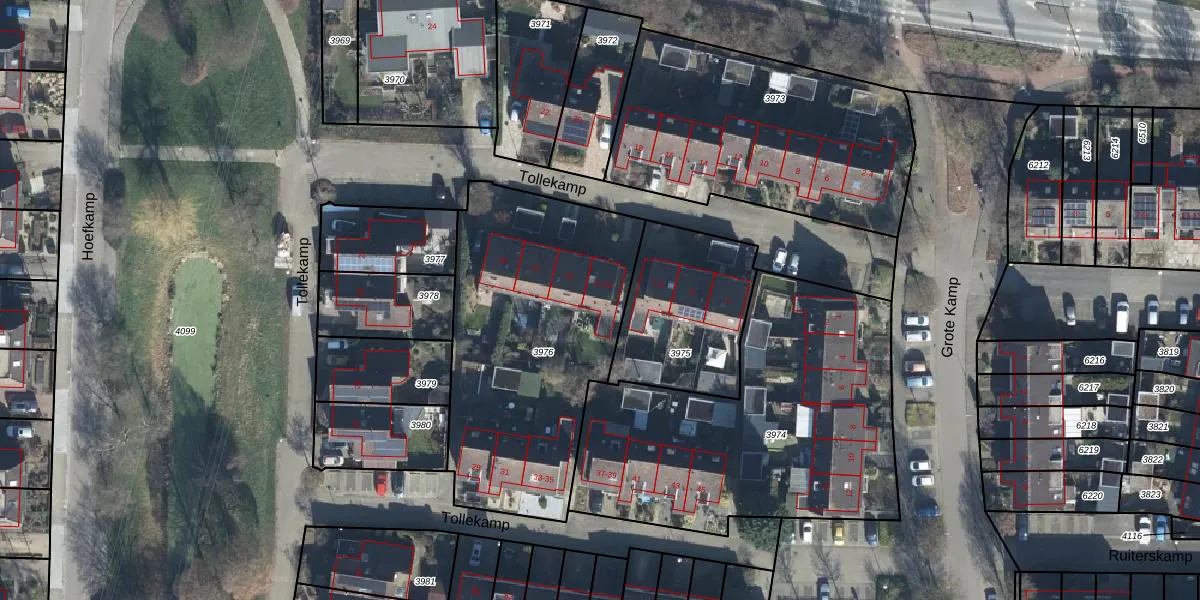 Het perceel waarop Tollekamp 11 staat heeft een oppervlakte van 1349 m². Dit is een zeer groot perceel. De perceeloppervlakte wordt geregistreerd door het Kadaster. Gedetailleerde informatie over de maten van dit perceel kunt u vinden in het rapport Kadastrale kaart met maatvoering van Tollekamp 11.