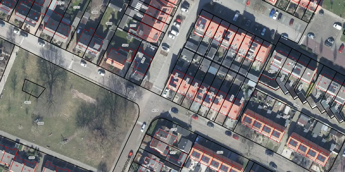 Het adres is gelegen op perceel 7800 in de sectie H en de kadastrale gemeente Rhenen. De kadastrale aanduiding is aldus RNN01-H-7800. Het perceel is kleiner dan gemiddeld in Rhenen. Het perceel is 235 m² groot, terwijl het gemiddelde ligt op 4305,05 m². De grootste perceeloppervlakte in de kadastrale gemeente is 1,05 km². De kleinste oppervlakte bedraagt 0 m². Dit is het enige adres dat aanwezig is op het perceel. In de Basisregistratie Kadaster (BRK) werden de grenzen van het perceel geregistreerd op 08-04-2015.