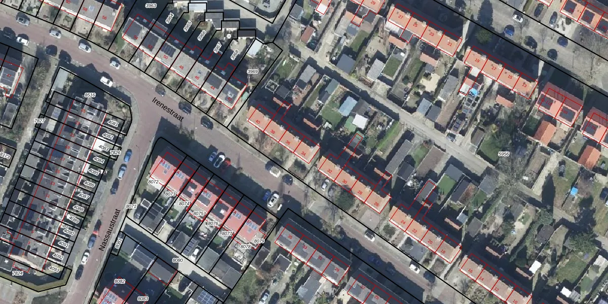Irenestraat 34 is gelegen op kadastraal perceel RNN01H5956. Deze kadastrale aanduiding is uniek en wordt gebruikt door het Kadaster om eigendomsrechten en andere zakelijke rechten vast te leggen. Het perceel maakt onderdeel uit van de kadastrale gemeente Rhenen.