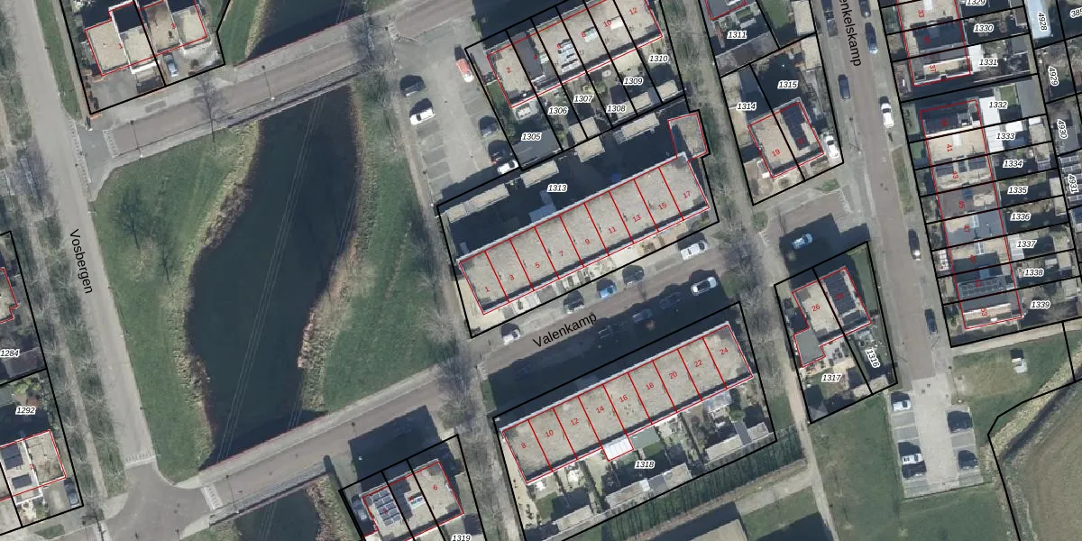 Valenkamp 5 is gelegen op kadastraal perceel ELS00M1313. Deze kadastrale aanduiding is uniek en wordt gebruikt door het Kadaster om eigendomsrechten en andere zakelijke rechten vast te leggen. Het perceel maakt onderdeel uit van de kadastrale gemeente Elst.
