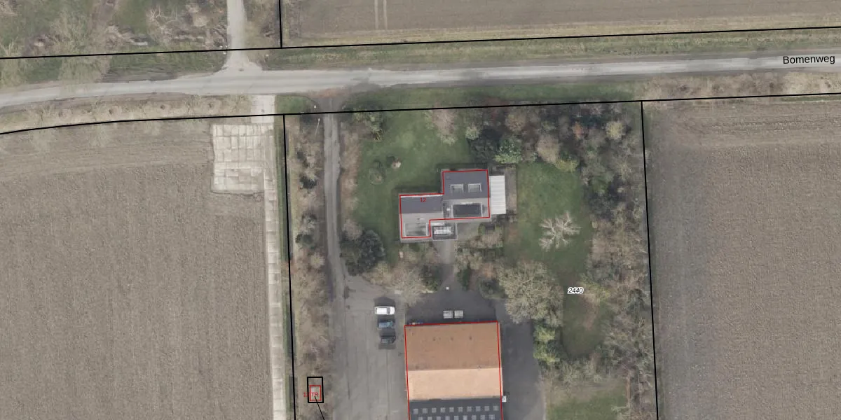 Bomenweg 12 is gelegen op kadastraal perceel NOP00A2440. Deze kadastrale aanduiding is uniek en wordt gebruikt door het Kadaster om eigendomsrechten en andere zakelijke rechten vast te leggen. Het perceel maakt onderdeel uit van de kadastrale gemeente Noordoostpolder.