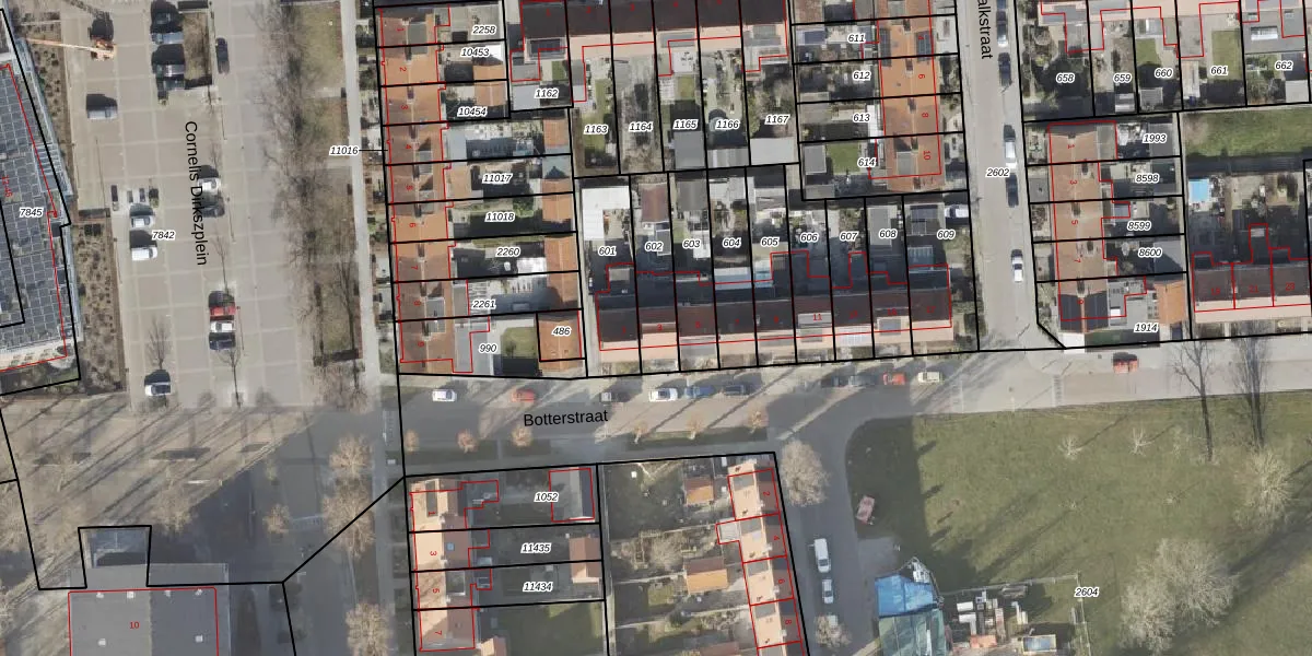 Het perceel waarop Botterstraat 3 staat heeft een oppervlakte van 181 m². Dit is een middelgroot perceel. De perceeloppervlakte wordt geregistreerd door het Kadaster. Gedetailleerde informatie over de maten van dit perceel kunt u vinden in het rapport Kadastrale kaart met maatvoering van Botterstraat 3.