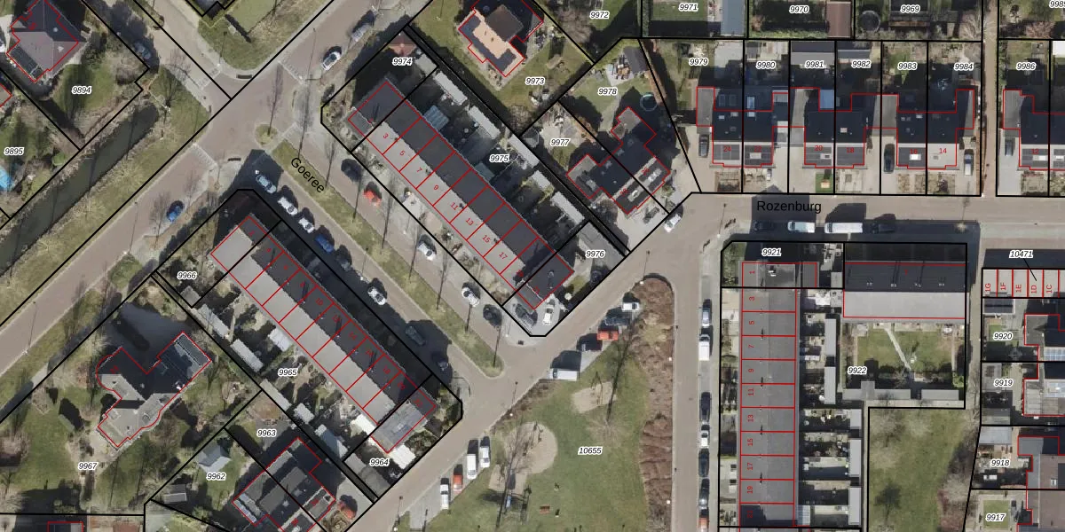 Het perceel waarop Goeree 19 staat heeft een oppervlakte van 1018 m². Dit is een zeer groot perceel. De perceeloppervlakte wordt geregistreerd door het Kadaster. Gedetailleerde informatie over de maten van dit perceel kunt u vinden in het rapport Kadastrale kaart met maatvoering van Goeree 19.