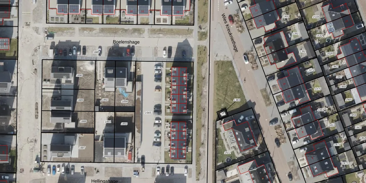 Het perceel waarop Hellingahage 32 staat heeft een oppervlakte van 1755 m². Dit is een zeer groot perceel. De perceeloppervlakte wordt geregistreerd door het Kadaster. Gedetailleerde informatie over de maten van dit perceel kunt u vinden in het rapport Kadastrale kaart met maatvoering van Hellingahage 32.