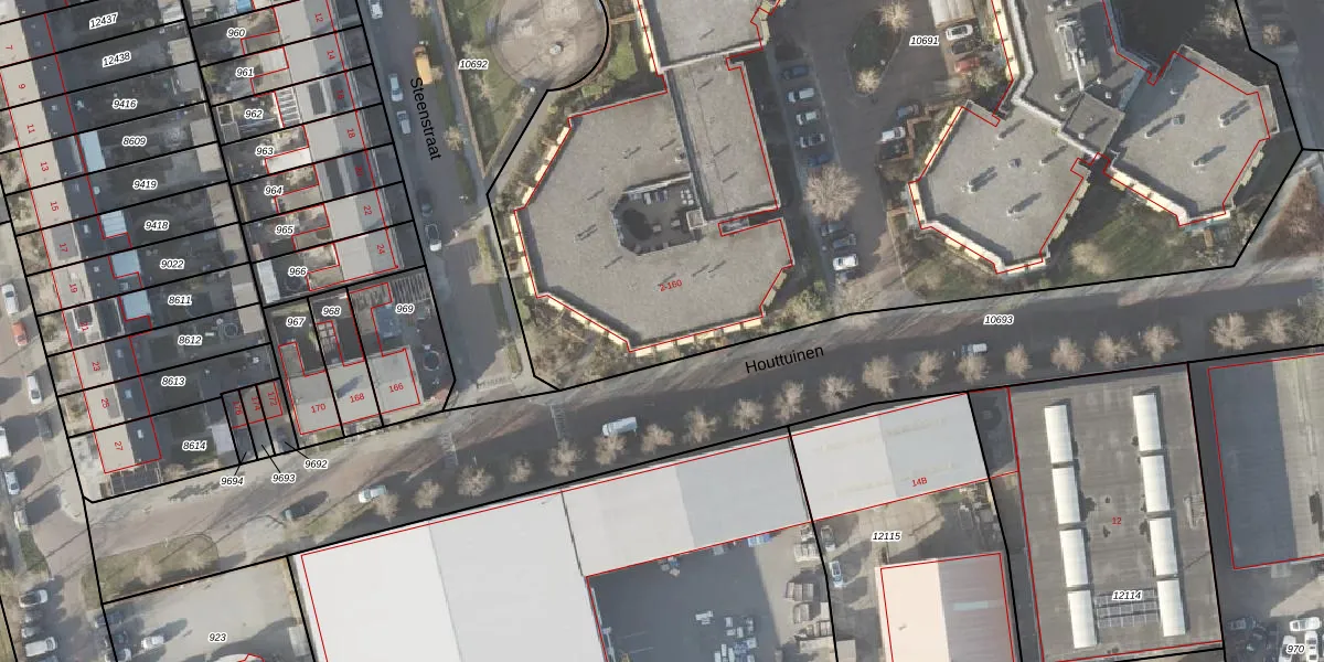 Het perceel waarop Houttuinen 104 staat heeft een oppervlakte van 1,1 ha. Dit is een zeer groot perceel. De perceeloppervlakte wordt geregistreerd door het Kadaster. Gedetailleerde informatie over de maten van dit perceel kunt u vinden in het rapport Kadastrale kaart met maatvoering van Houttuinen 104.
