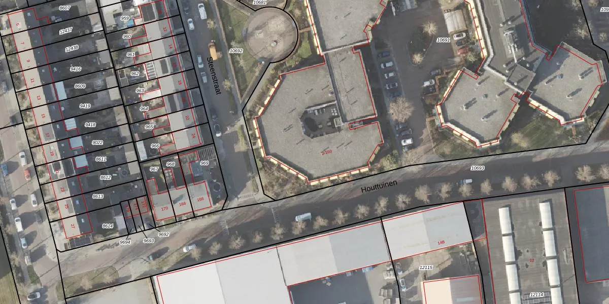 Het perceel waarop Houttuinen 112 staat heeft een oppervlakte van 1,1 ha. Dit is een zeer groot perceel. De perceeloppervlakte wordt geregistreerd door het Kadaster. Gedetailleerde informatie over de maten van dit perceel kunt u vinden in het rapport Kadastrale kaart met maatvoering van Houttuinen 112.