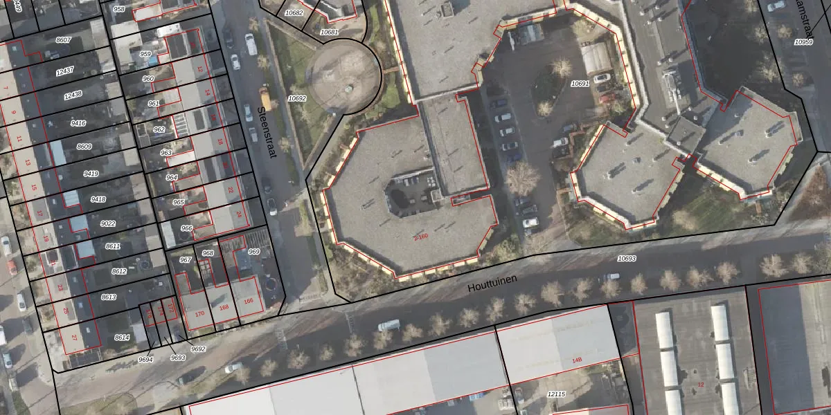Het perceel waarop Houttuinen 120 staat heeft een oppervlakte van 1,1 ha. Dit is een zeer groot perceel. De perceeloppervlakte wordt geregistreerd door het Kadaster. Gedetailleerde informatie over de maten van dit perceel kunt u vinden in het rapport Kadastrale kaart met maatvoering van Houttuinen 120.