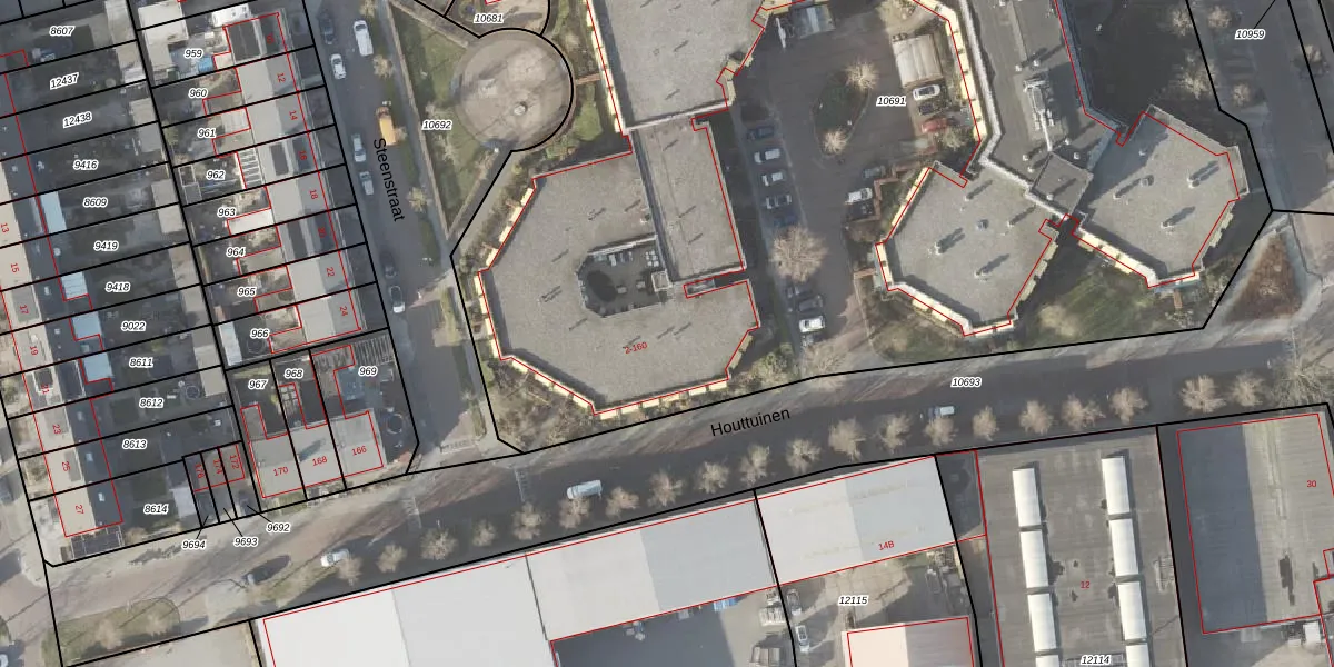 Het perceel waarop Houttuinen 30 staat heeft een oppervlakte van 1,1 ha. Dit is een zeer groot perceel. De perceeloppervlakte wordt geregistreerd door het Kadaster. Gedetailleerde informatie over de maten van dit perceel kunt u vinden in het rapport Kadastrale kaart met maatvoering van Houttuinen 30.