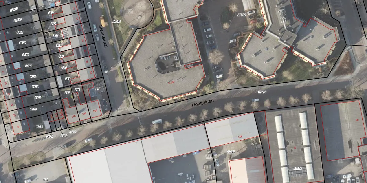 Het perceel waarop Houttuinen 96 staat heeft een oppervlakte van 1,1 ha. Dit is een zeer groot perceel. De perceeloppervlakte wordt geregistreerd door het Kadaster. Gedetailleerde informatie over de maten van dit perceel kunt u vinden in het rapport Kadastrale kaart met maatvoering van Houttuinen 96.