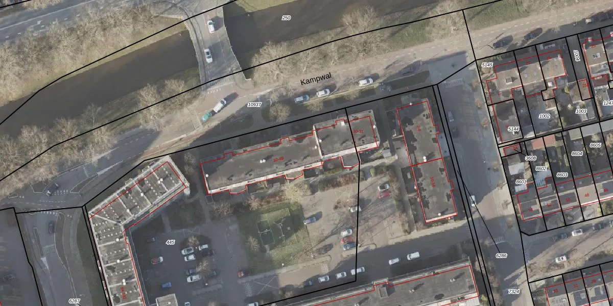 Het perceel waarop Kampwal 39 staat heeft een oppervlakte van 4695 m². Dit is een zeer groot perceel. De perceeloppervlakte wordt geregistreerd door het Kadaster. Gedetailleerde informatie over de maten van dit perceel kunt u vinden in het rapport Kadastrale kaart met maatvoering van Kampwal 39.