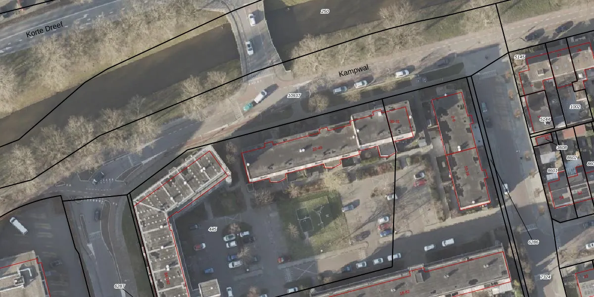 Het perceel waarop Kampwal 44 staat heeft een oppervlakte van 4695 m². Dit is een zeer groot perceel. De perceeloppervlakte wordt geregistreerd door het Kadaster. Gedetailleerde informatie over de maten van dit perceel kunt u vinden in het rapport Kadastrale kaart met maatvoering van Kampwal 44.