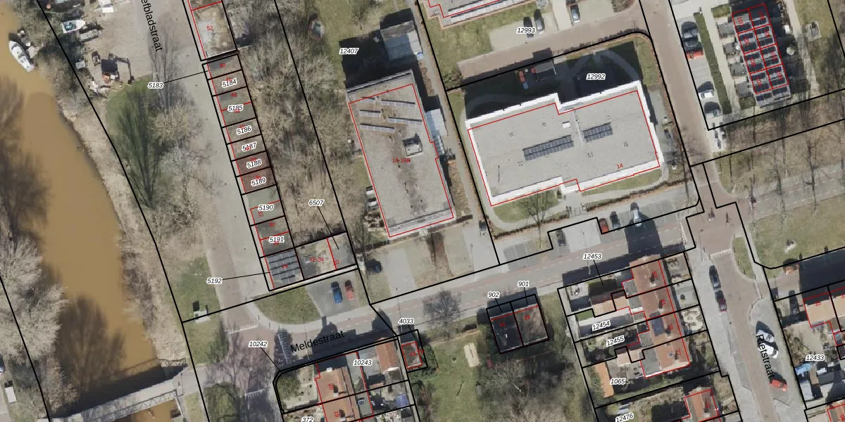 Het perceel waarop Meldestraat 18-G staat heeft een oppervlakte van 2675 m². Dit is een zeer groot perceel. De perceeloppervlakte wordt geregistreerd door het Kadaster. Gedetailleerde informatie over de maten van dit perceel kunt u vinden in het rapport Kadastrale kaart met maatvoering van Meldestraat 18-G.