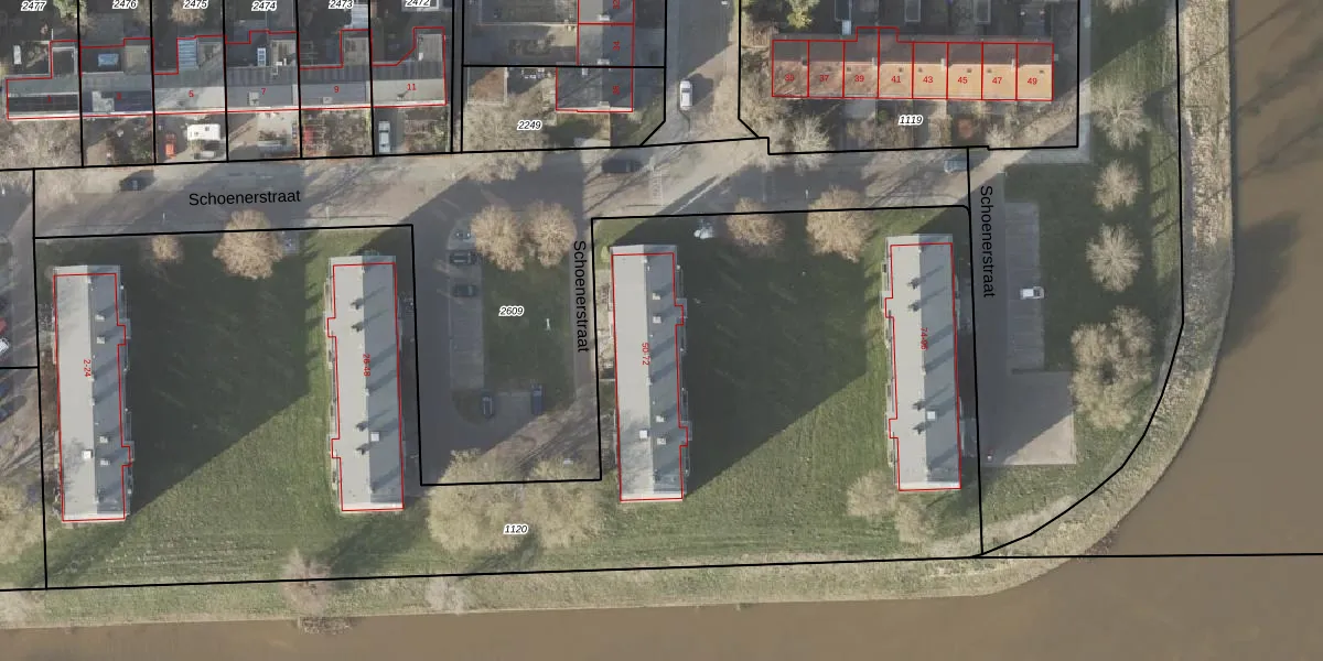 Het perceel waarop Schoenerstraat 54 staat heeft een oppervlakte van 6480 m². Dit is een zeer groot perceel. De perceeloppervlakte wordt geregistreerd door het Kadaster. Gedetailleerde informatie over de maten van dit perceel kunt u vinden in het rapport Kadastrale kaart met maatvoering van Schoenerstraat 54.