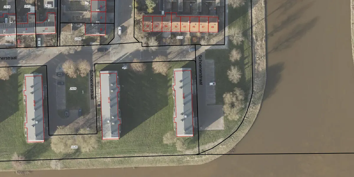 Het perceel waarop Schoenerstraat 80 staat heeft een oppervlakte van 6480 m². Dit is een zeer groot perceel. De perceeloppervlakte wordt geregistreerd door het Kadaster. Gedetailleerde informatie over de maten van dit perceel kunt u vinden in het rapport Kadastrale kaart met maatvoering van Schoenerstraat 80.