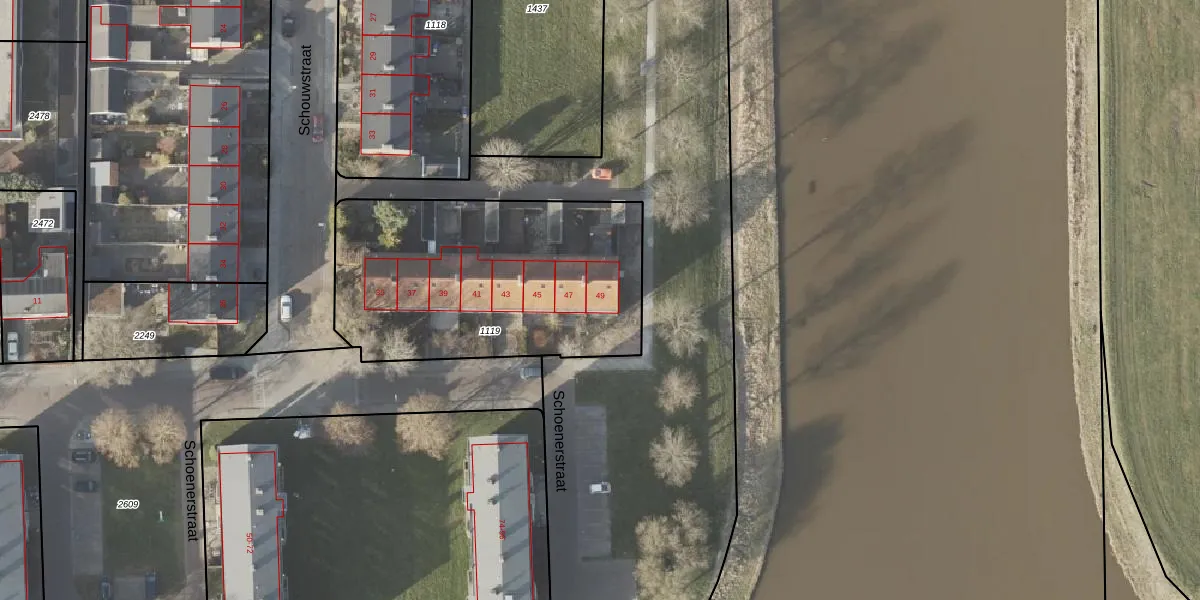 Schouwstraat 49 is gelegen op kadastraal perceel NOP00AZ1119. Deze kadastrale aanduiding is uniek en wordt gebruikt door het Kadaster om eigendomsrechten en andere zakelijke rechten vast te leggen. Het perceel maakt onderdeel uit van de kadastrale gemeente Noordoostpolder.