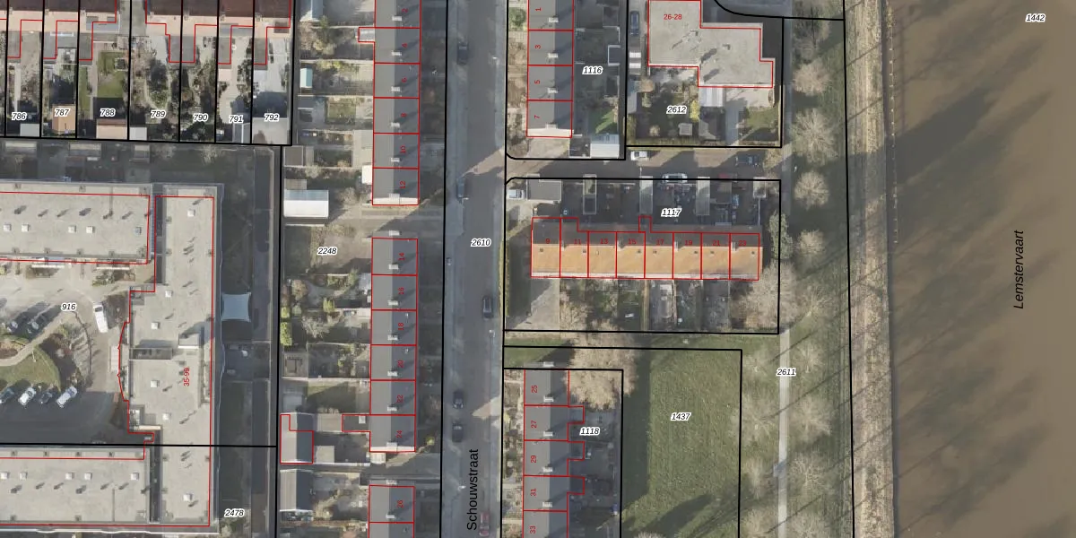 Het perceel waarop Schouwstraat 9 staat heeft een oppervlakte van 1463 m². Dit is een zeer groot perceel. De perceeloppervlakte wordt geregistreerd door het Kadaster. Gedetailleerde informatie over de maten van dit perceel kunt u vinden in het rapport Kadastrale kaart met maatvoering van Schouwstraat 9.