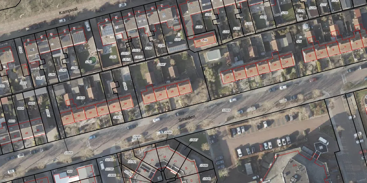 Het perceel waarop Smeden 26 staat heeft een oppervlakte van 1150 m². Dit is een zeer groot perceel. De perceeloppervlakte wordt geregistreerd door het Kadaster. Gedetailleerde informatie over de maten van dit perceel kunt u vinden in het rapport Kadastrale kaart met maatvoering van Smeden 26.