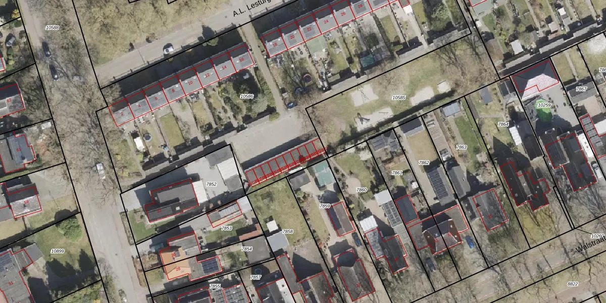 Het perceel waarop A.L. Lesturgeonstraat 16-GB19 staat heeft een oppervlakte van 4694 m². Dit is een zeer groot perceel. De perceeloppervlakte wordt geregistreerd door het Kadaster. Gedetailleerde informatie over de maten van dit perceel kunt u vinden in het rapport Kadastrale kaart met maatvoering van A.L. Lesturgeonstraat 16-GB19.