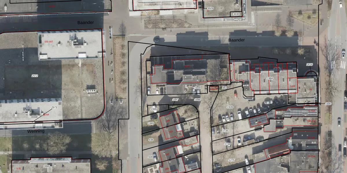 Het perceel waarop Baander 43 staat heeft een oppervlakte van 1008 m². Dit is een zeer groot perceel. De perceeloppervlakte wordt geregistreerd door het Kadaster. Gedetailleerde informatie over de maten van dit perceel kunt u vinden in het rapport Kadastrale kaart met maatvoering van Baander 43.