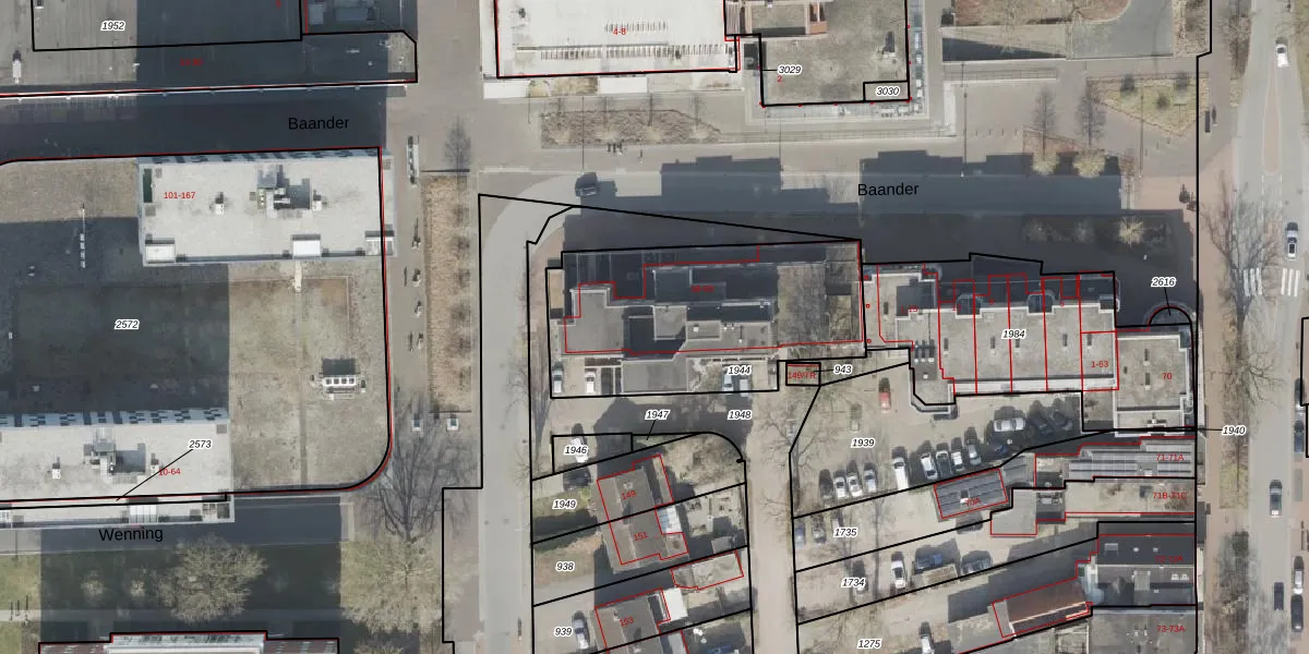 Het perceel waarop Baander 73 staat heeft een oppervlakte van 1008 m². Dit is een zeer groot perceel. De perceeloppervlakte wordt geregistreerd door het Kadaster. Gedetailleerde informatie over de maten van dit perceel kunt u vinden in het rapport Kadastrale kaart met maatvoering van Baander 73.