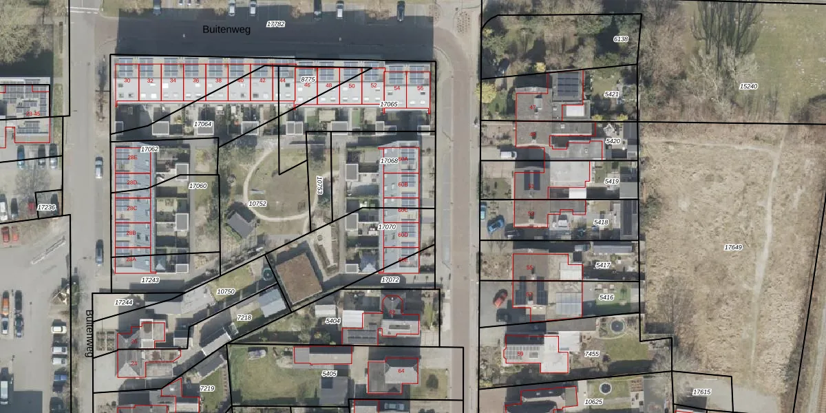 Het perceel waarop Buitenweg 60-C staat heeft een oppervlakte van 477 m². Dit is een groot perceel. De perceeloppervlakte wordt geregistreerd door het Kadaster. Gedetailleerde informatie over de maten van dit perceel kunt u vinden in het rapport Kadastrale kaart met maatvoering van Buitenweg 60-C.
