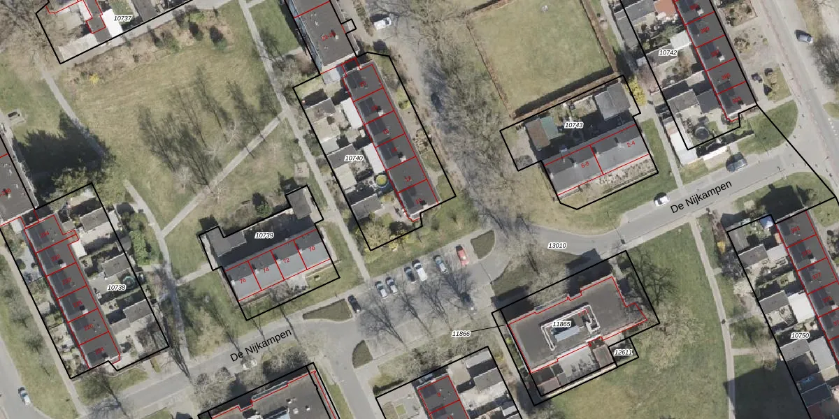 Het perceel waarop De Nijkampen 10 staat heeft een oppervlakte van 1447 m². Dit is een zeer groot perceel. De perceeloppervlakte wordt geregistreerd door het Kadaster. Gedetailleerde informatie over de maten van dit perceel kunt u vinden in het rapport Kadastrale kaart met maatvoering van De Nijkampen 10.