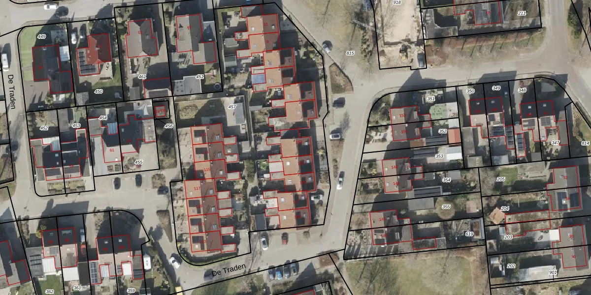 Het perceel waarop De Traden 133 staat heeft een oppervlakte van 3510 m². Dit is een zeer groot perceel. De perceeloppervlakte wordt geregistreerd door het Kadaster. Gedetailleerde informatie over de maten van dit perceel kunt u vinden in het rapport Kadastrale kaart met maatvoering van De Traden 133.