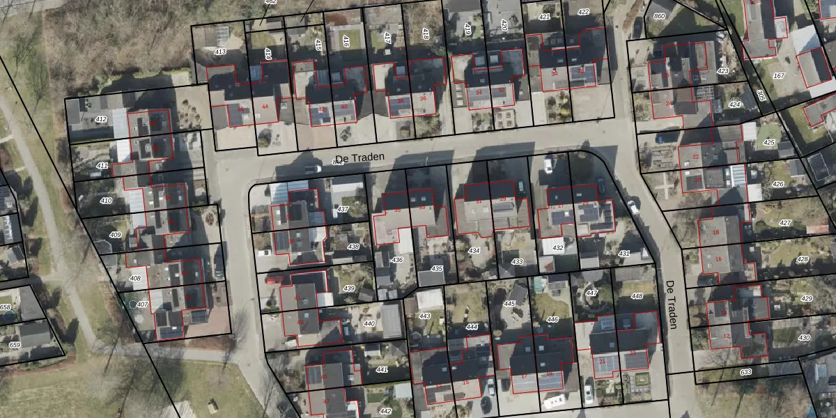 Het perceel waarop De Traden 33 staat heeft een oppervlakte van 278 m². Dit is een middelgroot perceel. De perceeloppervlakte wordt geregistreerd door het Kadaster. Gedetailleerde informatie over de maten van dit perceel kunt u vinden in het rapport Kadastrale kaart met maatvoering van De Traden 33.