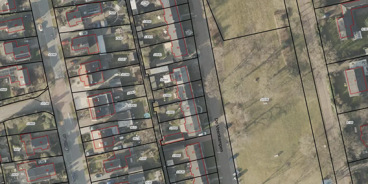 De Veenkampen 21 is gelegen op kadastraal perceel EMN00C10992. Deze kadastrale aanduiding is uniek en wordt gebruikt door het Kadaster om eigendomsrechten en andere zakelijke rechten vast te leggen. Het perceel maakt onderdeel uit van de kadastrale gemeente Emmen.