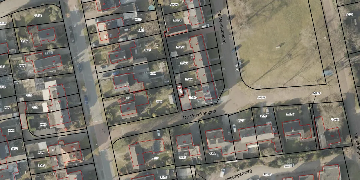 Het perceel waarop De Veenkampen 9-TR staat heeft een oppervlakte van 20 m². Dit is een klein perceel. De perceeloppervlakte wordt geregistreerd door het Kadaster. Gedetailleerde informatie over de maten van dit perceel kunt u vinden in het rapport Kadastrale kaart met maatvoering van De Veenkampen 9-TR.