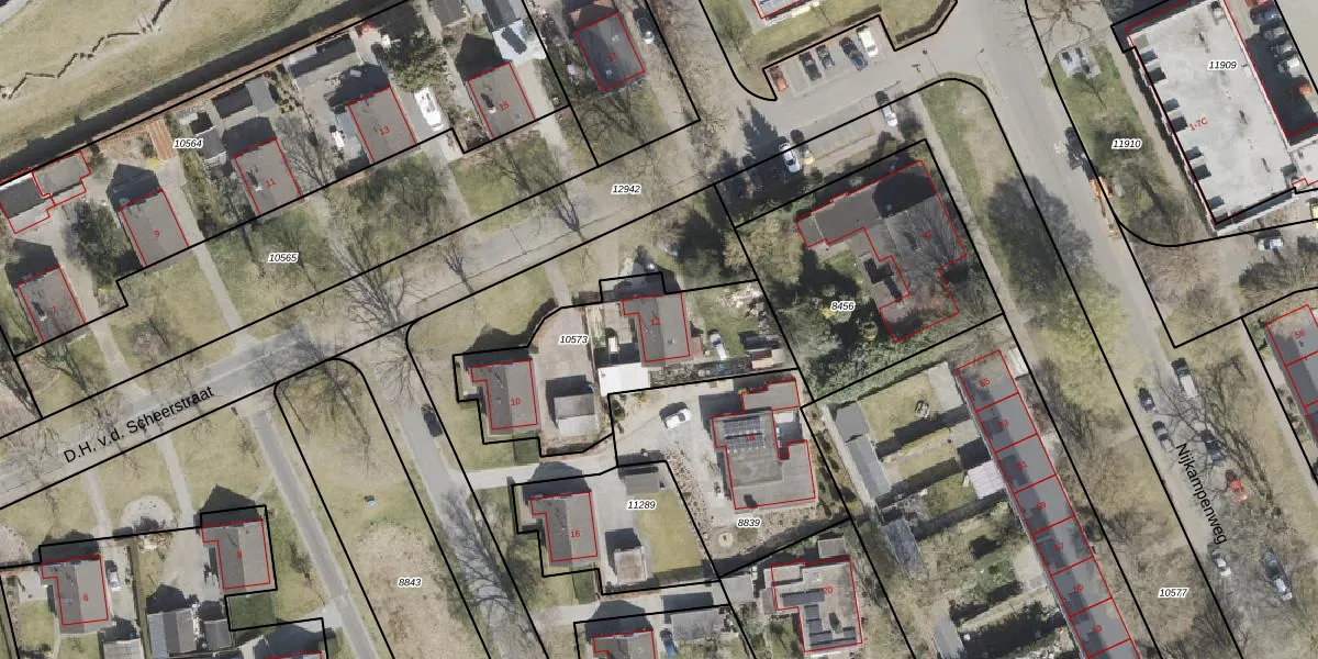 Het perceel waarop D.H. v.d. Scheerstraat 12 staat heeft een oppervlakte van 757 m². Dit is een groot perceel. De perceeloppervlakte wordt geregistreerd door het Kadaster. Gedetailleerde informatie over de maten van dit perceel kunt u vinden in het rapport Kadastrale kaart met maatvoering van D.H. v.d. Scheerstraat 12.