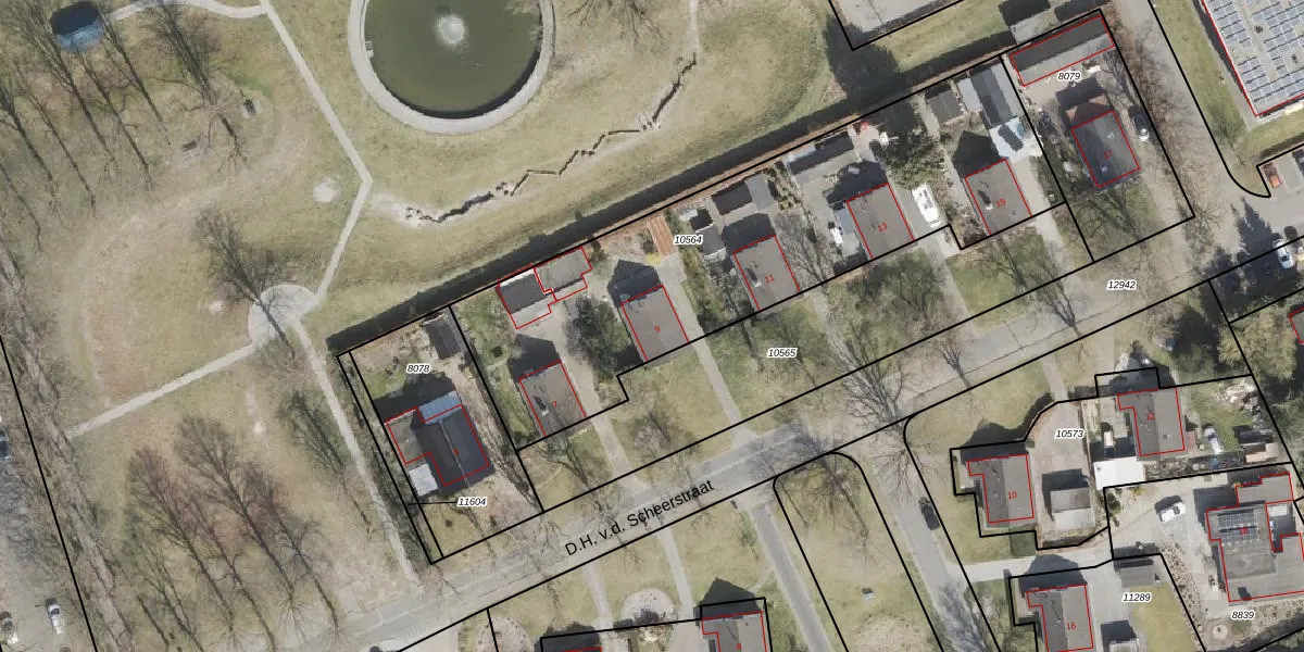 Het perceel waarop D.H. v.d. Scheerstraat 9 staat heeft een oppervlakte van 2070 m². Dit is een zeer groot perceel. De perceeloppervlakte wordt geregistreerd door het Kadaster. Gedetailleerde informatie over de maten van dit perceel kunt u vinden in het rapport Kadastrale kaart met maatvoering van D.H. v.d. Scheerstraat 9.