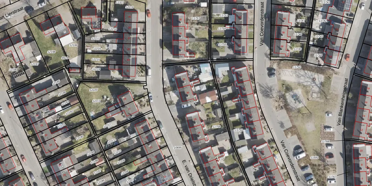 Het perceel waarop E. van Drielststraat 30 staat heeft een oppervlakte van 1937 m². Dit is een zeer groot perceel. De perceeloppervlakte wordt geregistreerd door het Kadaster. Gedetailleerde informatie over de maten van dit perceel kunt u vinden in het rapport Kadastrale kaart met maatvoering van E. van Drielststraat 30.